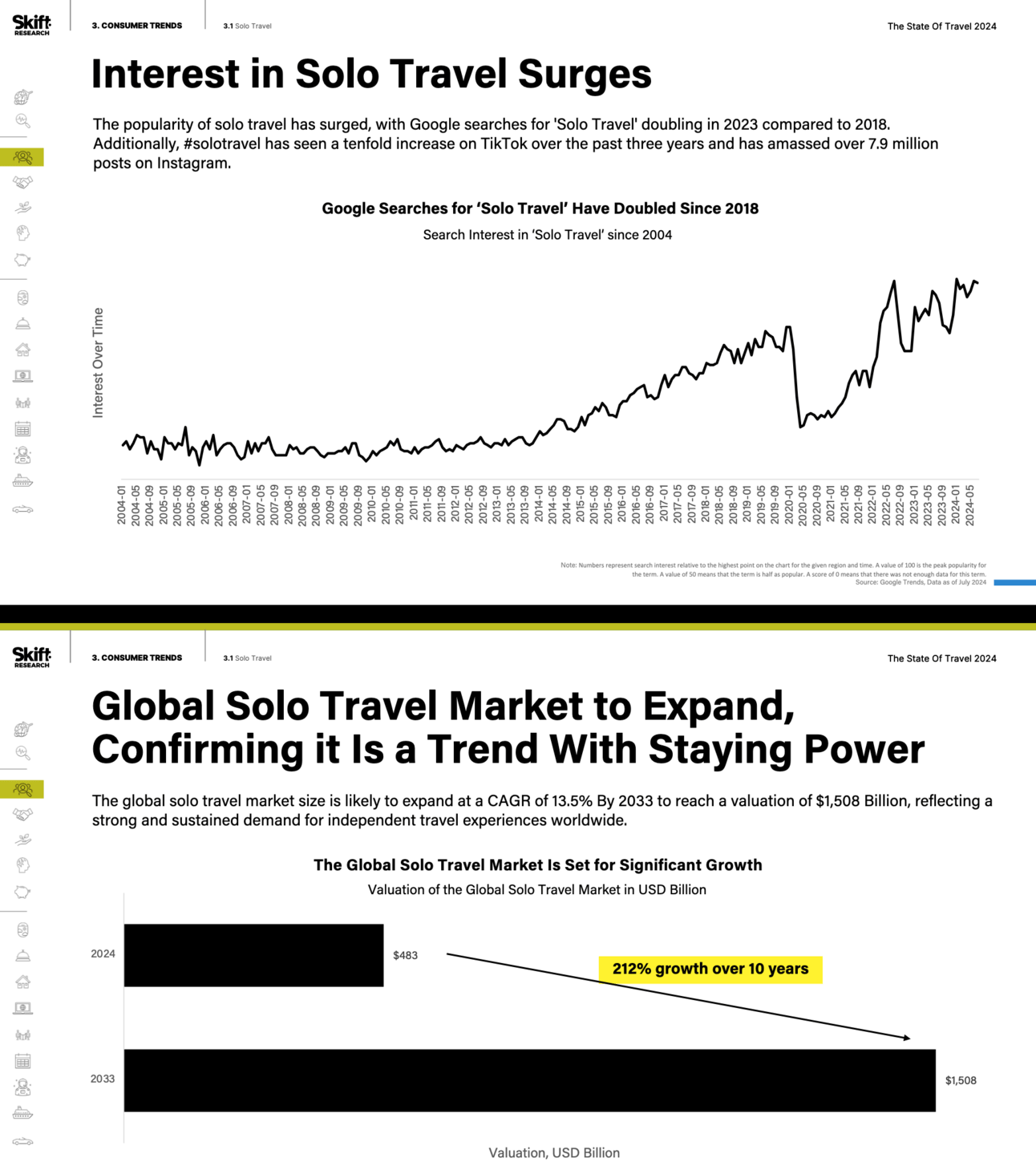 Interest in solo travel is increasing, indicating it’s now a long-term trend in the travel industry.