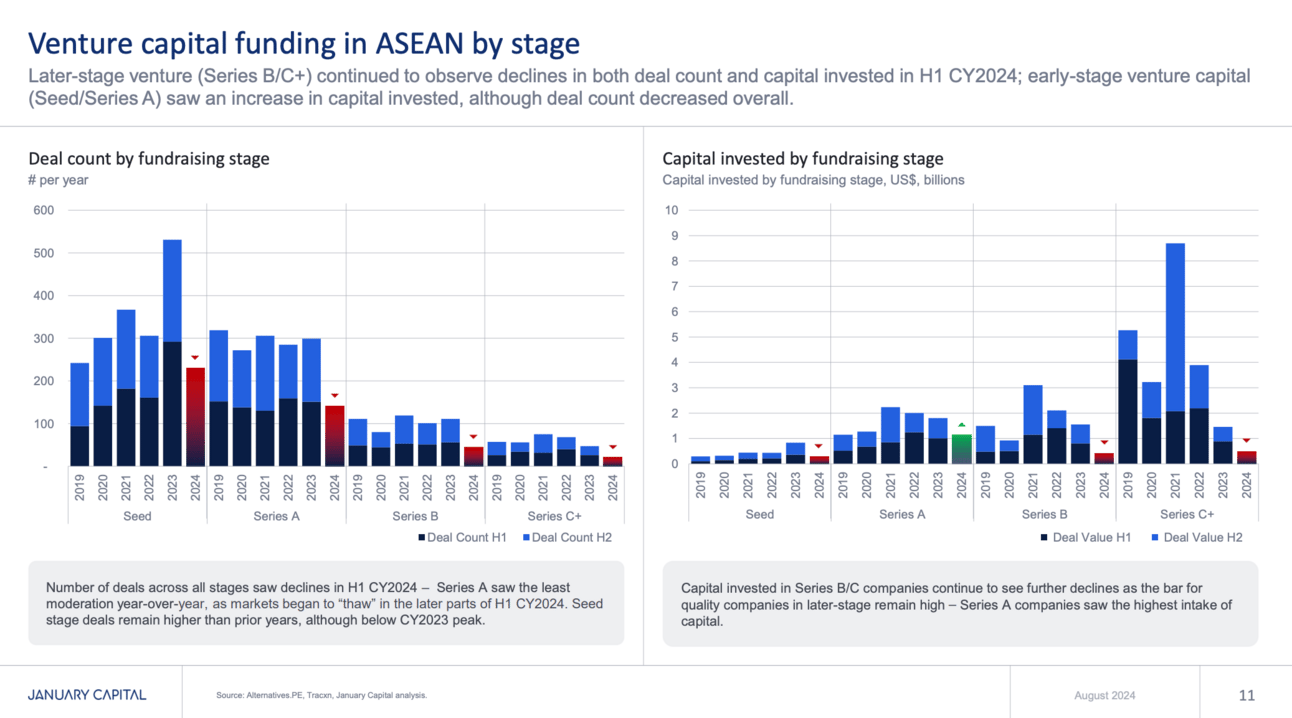 January Capital released the State of the ASEAN Technology Ecosystem Report, revealing a significant slowdown across Seed through Series C+ stages. Malaysia and the Philippines are experiencing positive growth, while the rest of the region is seeing a decline in deal count.