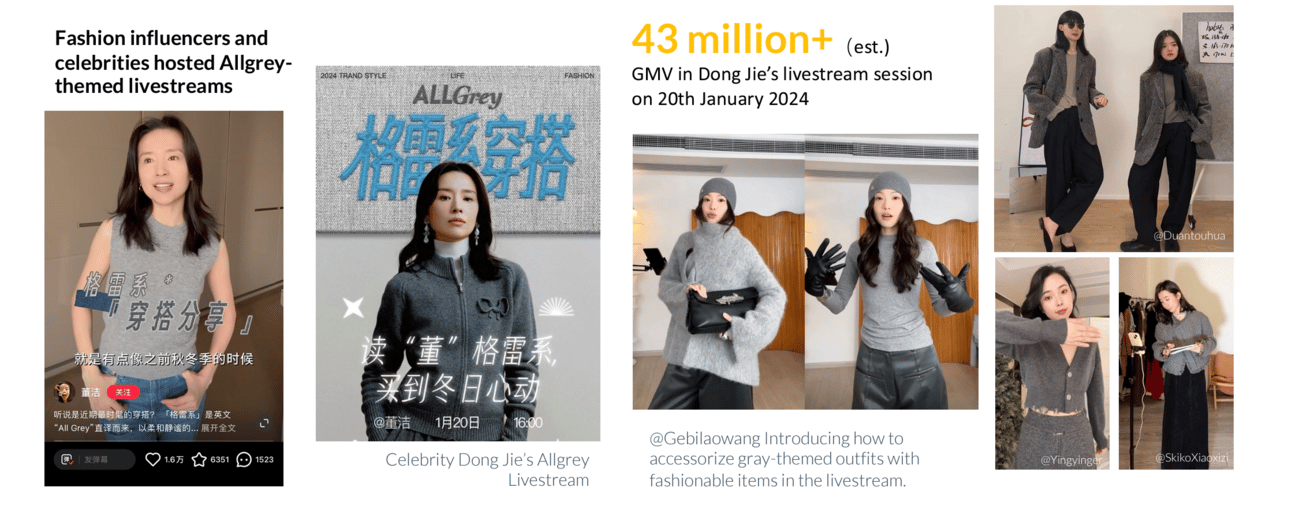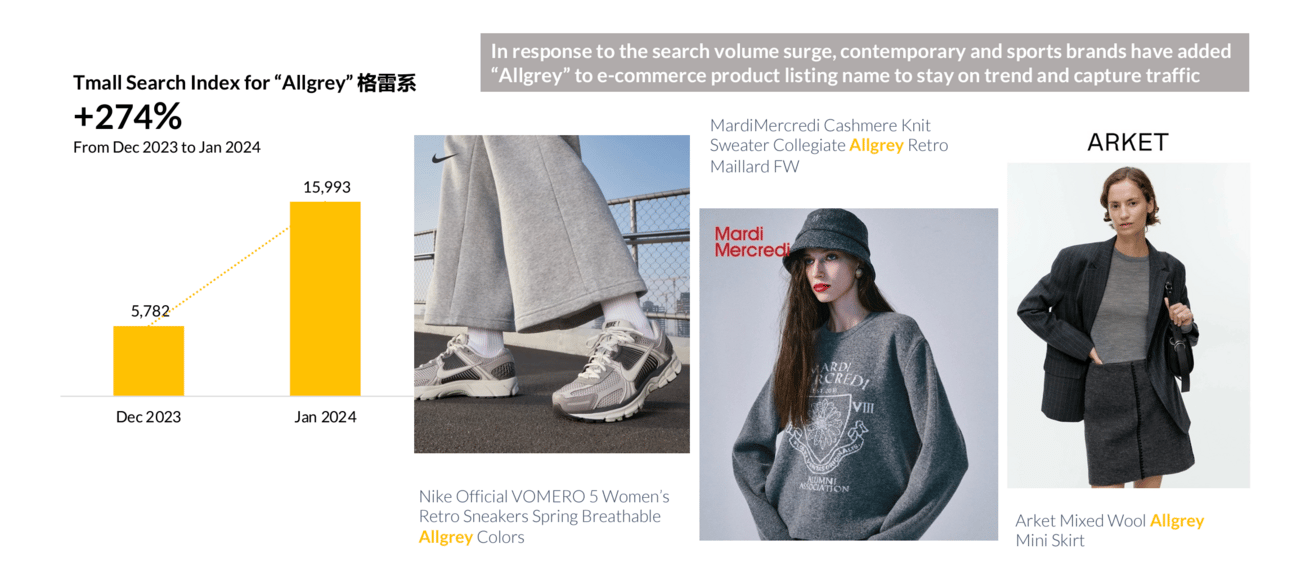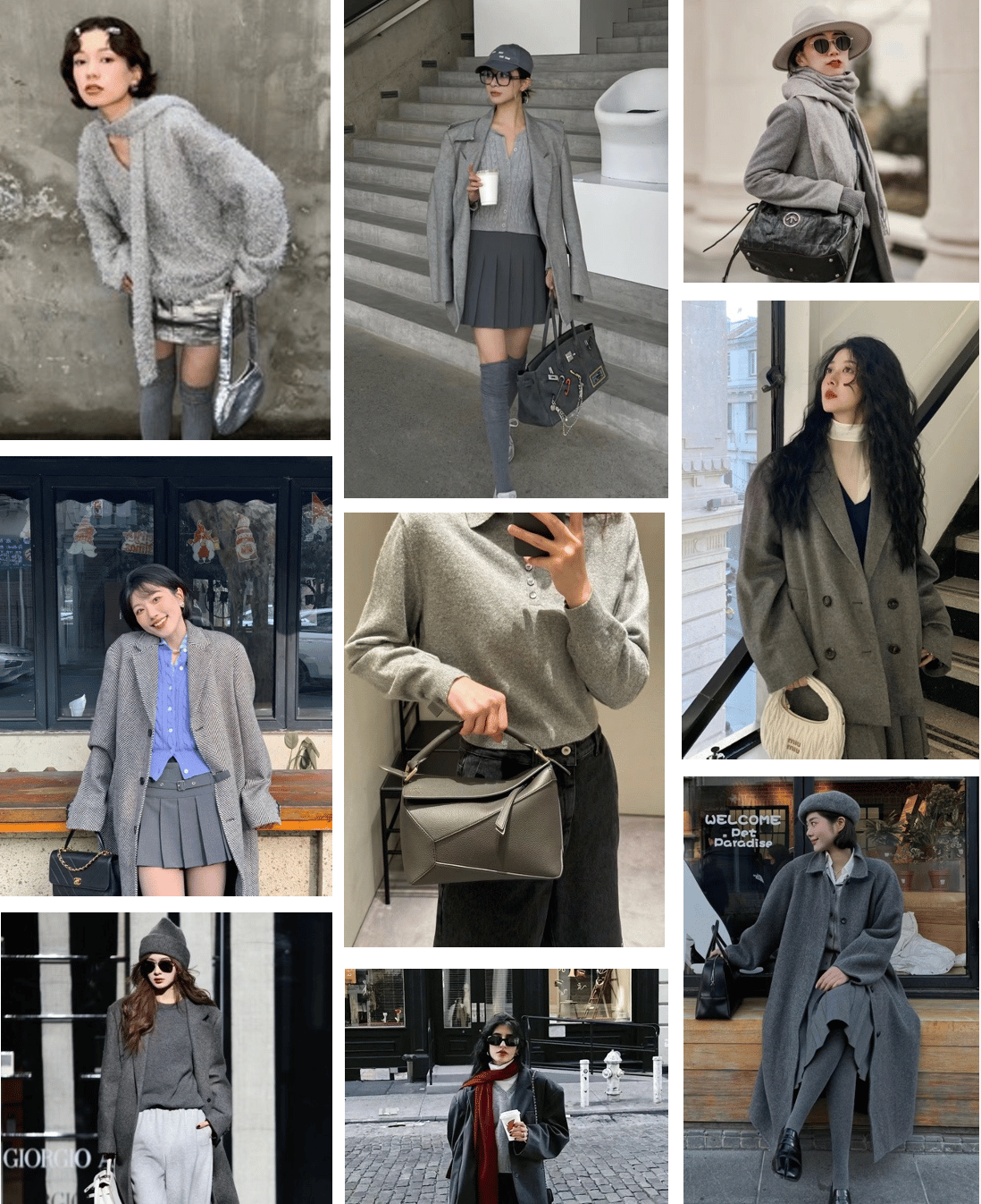 This winter witnessed the rise of the "Allgrey" fashion trend in China. Initially referred to as "grey colour scheme fashion" or "classy grey fashion," the concept gained widespread popularity on December 15, 2023, when the Chinese social media platform RED (Xiaohongshu) launched the #allgreycampaign, amplifying high-quality content and propelling the concept into the mainstream. This trend was swiftly embraced by numerous brands, igniting a fashion frenzy.