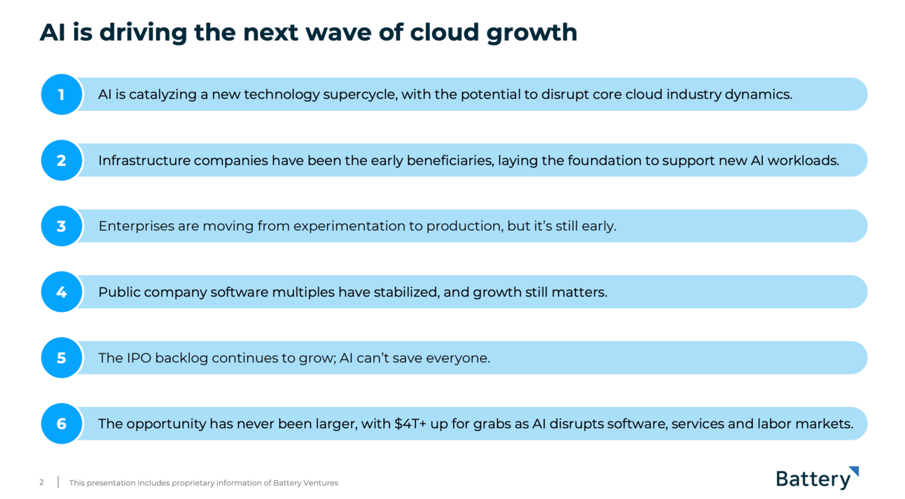 If you feel like you missed the cloud boom, the AI supercycle is your second chance. Even if cloud isn’t your focus, skimming parts of this deck is worth it—it covers how pricing models are shifting toward outcome-based approaches, the key players driving different motions and emerging categories (including GTM), and the current state of SaaS, which is stabilizing but down from previous years. Read the deck